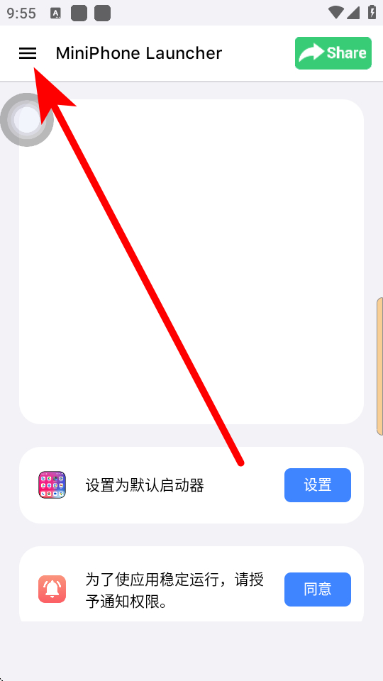 2、在MiniPhoneLauncher應(yīng)用界面,點(diǎn)擊左上角三條橫線的菜單圖標(biāo)。