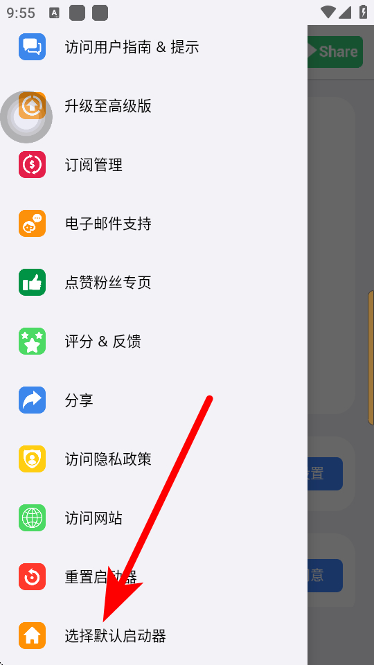 3、在彈出的菜單中,點(diǎn)擊選擇默認(rèn)啟動(dòng)器選項(xiàng)。