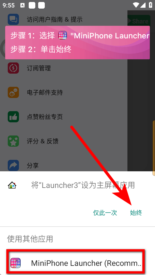 4、在選擇默認(rèn)啟動(dòng)器的界面中,選擇MiniPhoneLauncher,然后單擊始終選項(xiàng),即可完成設(shè)置。