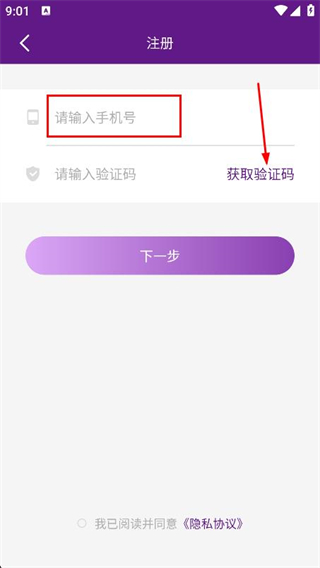 2、在注冊頁面,輸入手機(jī)號碼,并點(diǎn)擊獲取驗(yàn)證碼。