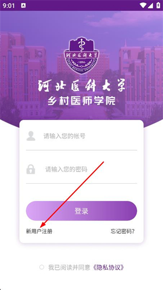 1、打開河北鄉(xiāng)醫(yī)app,在登錄頁面點(diǎn)擊新用戶注冊。