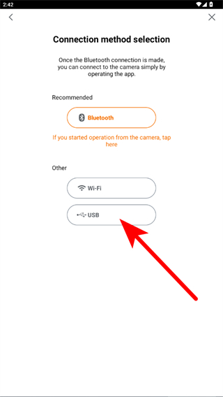3、在連接方式選擇界面,點(diǎn)擊USB選項(xiàng)。