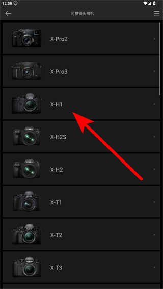 3、在可換鏡頭相機列表中,選擇與自己相機對應(yīng)的型號,比如X-H1。