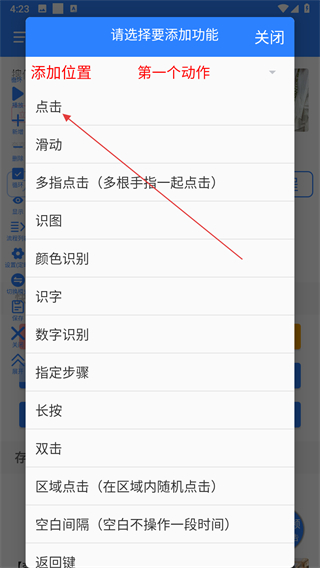 2、在彈出的請選擇要添加功能菜單中,選擇點擊等所需動作。