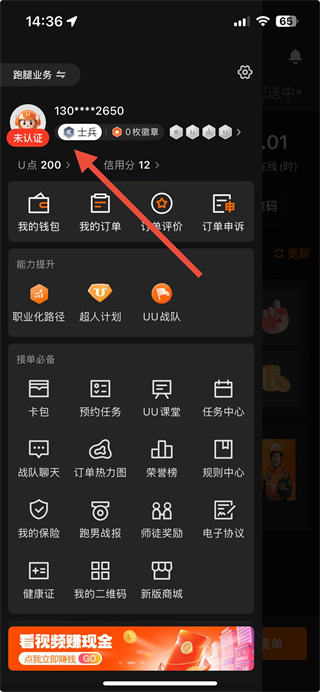 1、在UU跑腿跑男端左上角點(diǎn)擊個(gè)人頁面,點(diǎn)擊頭像區(qū)域,進(jìn)入個(gè)人信息頁面。