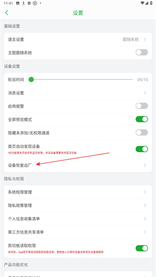 3、在設(shè)置的頁(yè)面內(nèi),向下滑動(dòng)找到并點(diǎn)擊設(shè)備恢復(fù)出廠的按鈕。