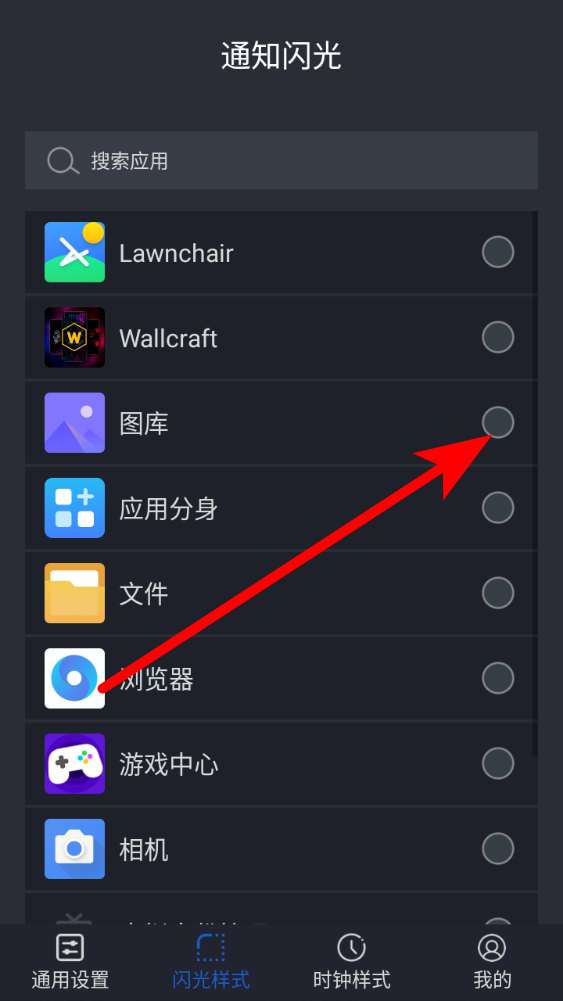 3、在通知閃光界面,選擇想要設置閃光樣式的應用如圖庫,進入閃光配置界面。