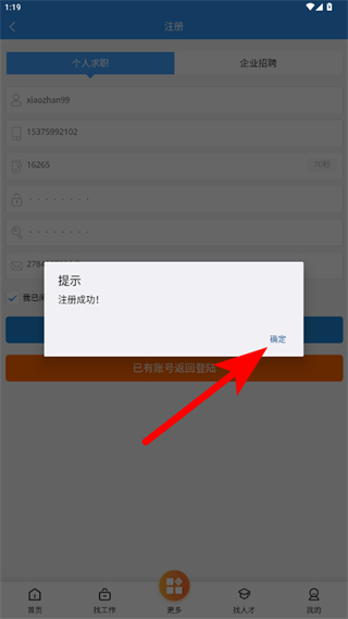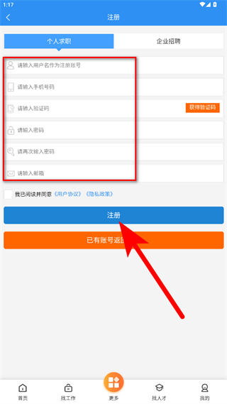 3、在注冊界面的個人求職欄,依次填寫用戶名、手機號碼、驗證碼、密碼、確認密碼、郵箱,勾選同意協(xié)議后點擊注冊按鈕。