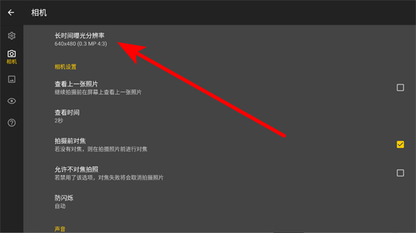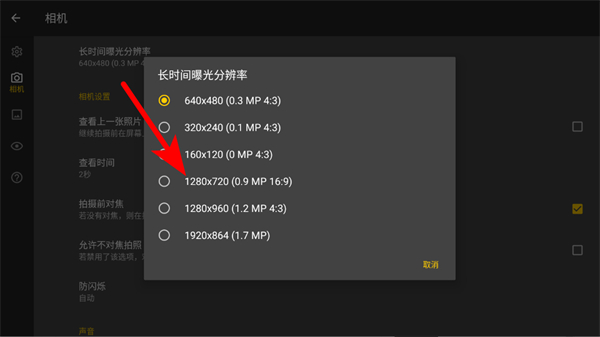 2、進入相機設(shè)置頁面后,點擊長時間曝光分辨率選項。