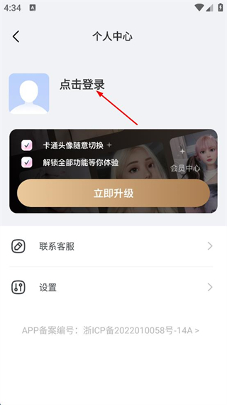 1、打開(kāi)卡通相機(jī)APP,點(diǎn)擊頁(yè)面右上角個(gè)人中心圖標(biāo)。