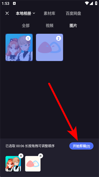 2.在素材選擇界面,選擇需要作為主畫面的視頻或圖片,點擊開始剪輯按鈕進入剪輯界面。
