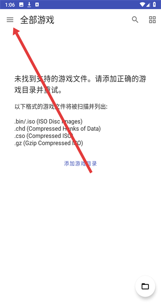 2、進(jìn)入“全部游戲”頁面后,點(diǎn)擊左上角菜單按鈕,展開功能菜單。