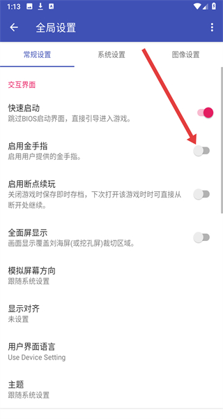 4、在全局設(shè)置頁面的常規(guī)設(shè)置中,點(diǎn)擊“啟用金手指”右側(cè)的開關(guān),將其開啟。