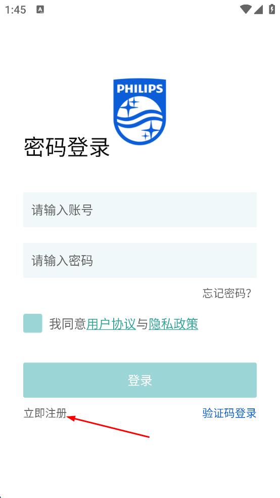 1、打開飛利浦APP登錄頁面,點(diǎn)擊“立即注冊(cè)”選項(xiàng)。