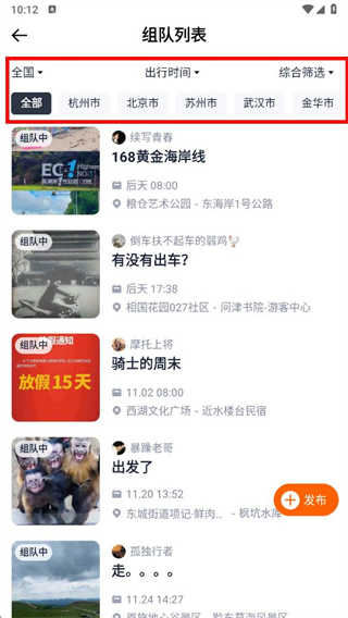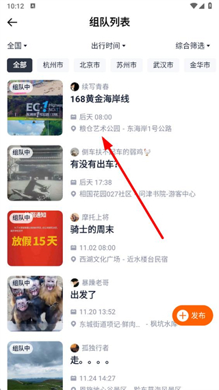3、在組隊列表頁面可篩選地區(qū)、出行時間等,找到合適的組隊信息后點擊進入詳情頁。