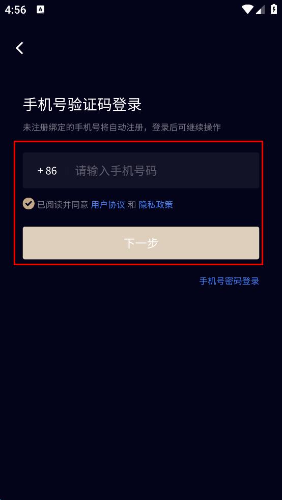 3、在手機號驗證碼登錄頁面,輸入手機號碼,點擊下一步按鈕。