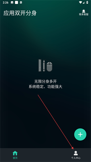 1、打開應用雙開分身應用,點擊個人中心選項,進入個人中心。
