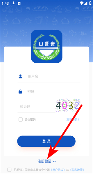 1、打開山餐安APP,在登錄界面點擊注冊驗證,進入企業(yè)注冊頁面。