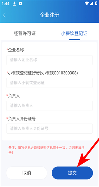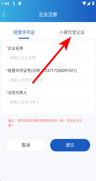 2、在企業(yè)注冊頁面,點擊小餐飲登記證選項卡,切換到小餐飲登記證注冊界面。