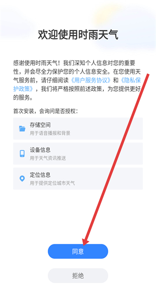1、在時(shí)雨天氣的“用戶(hù)服務(wù)協(xié)議與隱私保護(hù)政策”彈窗點(diǎn)擊“同意”,進(jìn)入“添加城市”頁(yè)面。