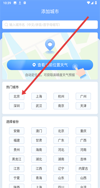 2、在“添加城市”頁(yè)面點(diǎn)擊熱門(mén)城市中的“北京”,進(jìn)入北京市天氣頁(yè)面。