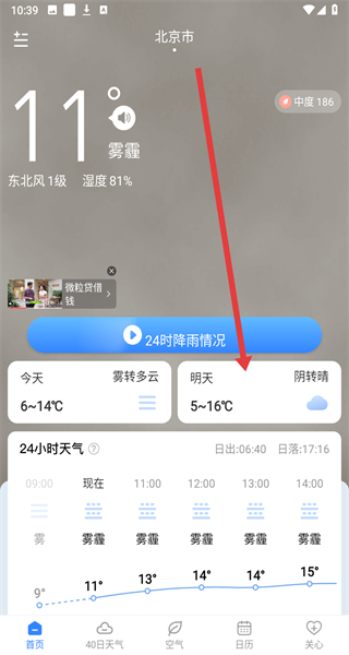 3、在北京市天氣頁(yè)面點(diǎn)擊“明天”天氣區(qū)域,進(jìn)入查看明天天氣預(yù)報(bào)信息。
