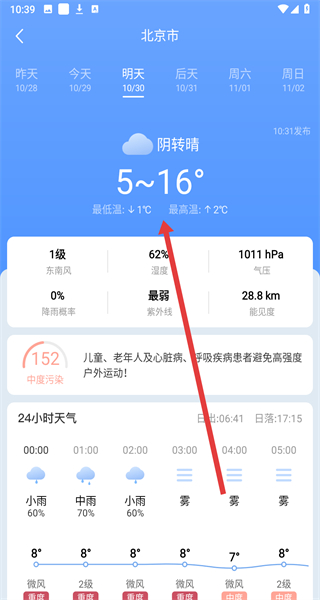 4、在進(jìn)入到預(yù)報(bào)頁(yè)面,即可查看北京市明天的詳細(xì)天氣信息,包括溫度、天氣狀況、風(fēng)力、濕度等。