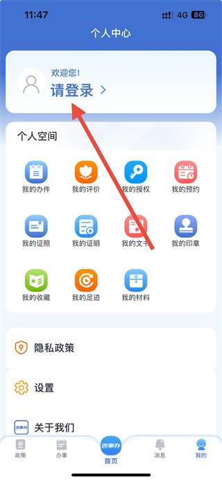 2、在個(gè)人中心頁(yè)面點(diǎn)擊請(qǐng)登錄區(qū)域,進(jìn)入個(gè)人登錄頁(yè)面。