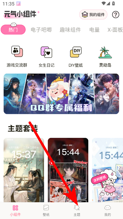 1、在元?dú)庑〗M件app首頁,點(diǎn)擊底部主題選項(xiàng),進(jìn)入主題頁面。