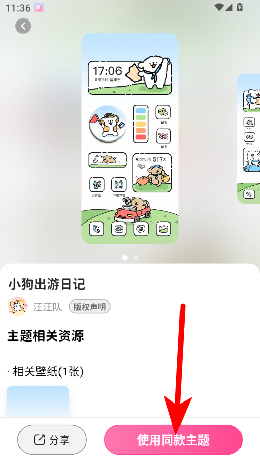 4、在主題詳情頁面,點(diǎn)擊使用同款主題按鈕,即可更換主題背景。