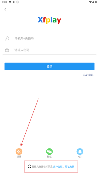 3、進(jìn)入登錄的頁(yè)面內(nèi),勾選后并點(diǎn)擊下方微博登錄即可。