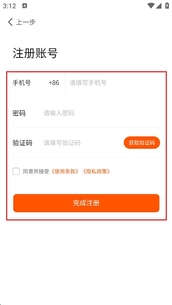 4、在注冊(cè)賬號(hào)頁面,輸入手機(jī)號(hào)、密碼,點(diǎn)擊“獲取驗(yàn)證碼”并輸入,勾選同意相關(guān)條款,點(diǎn)擊“完成注冊(cè)”。