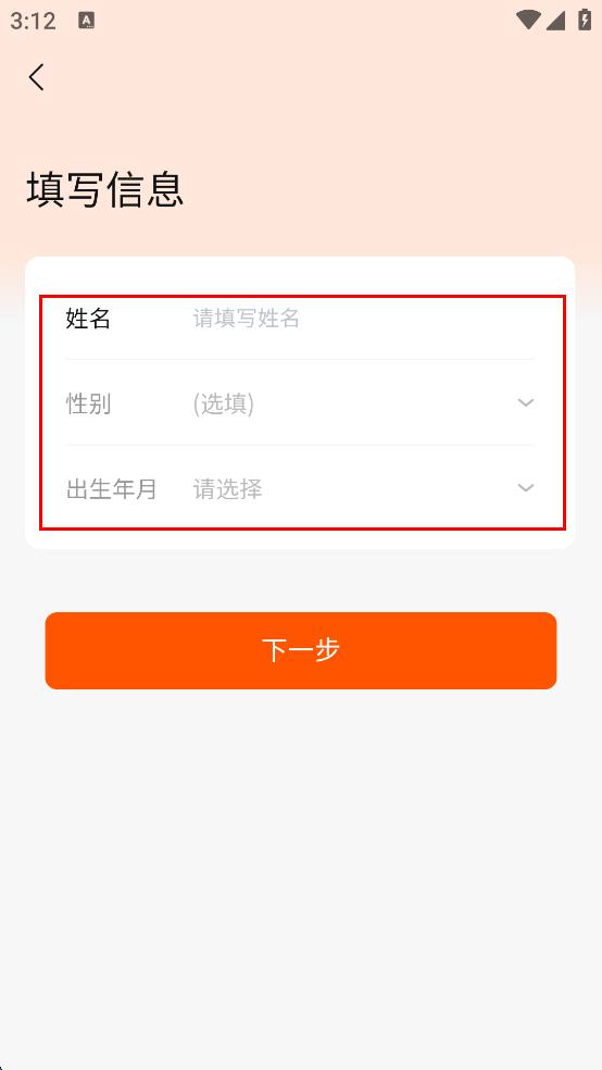 3、進(jìn)入填寫信息頁面,填寫姓名,選填性別,選擇出生年月,然后點(diǎn)擊“下一步”。