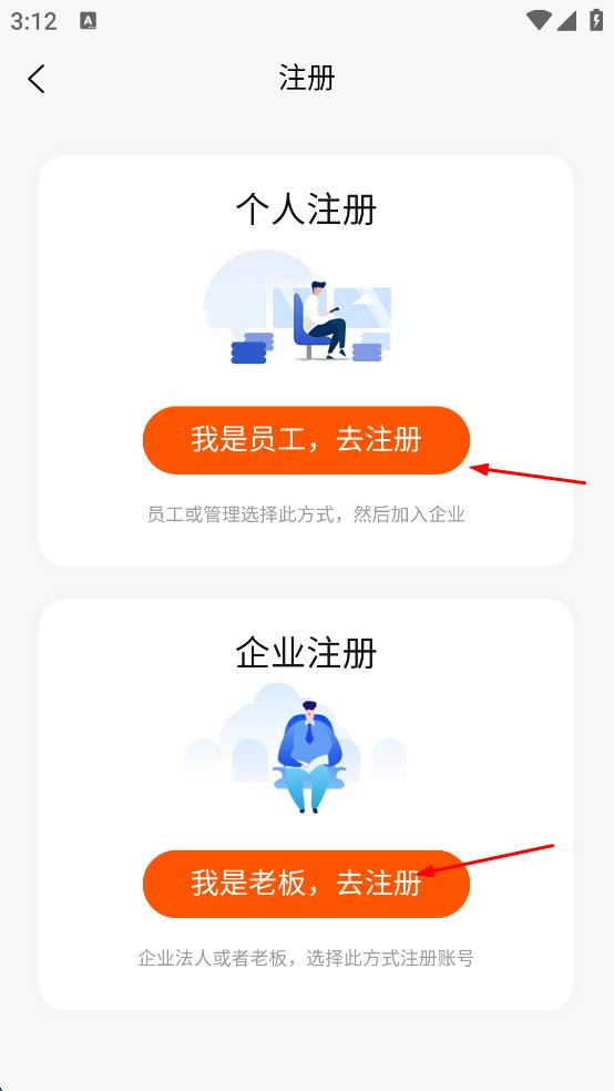 2、在注冊(cè)頁面,根據(jù)自身情況選擇“我是員工,去注冊(cè)”或“我是老板,去注冊(cè)”。