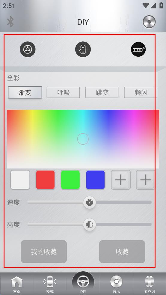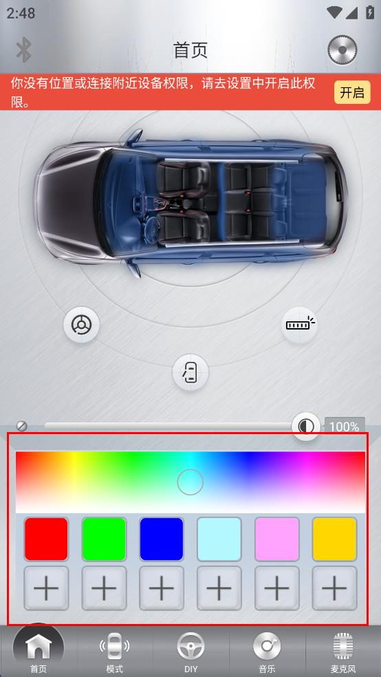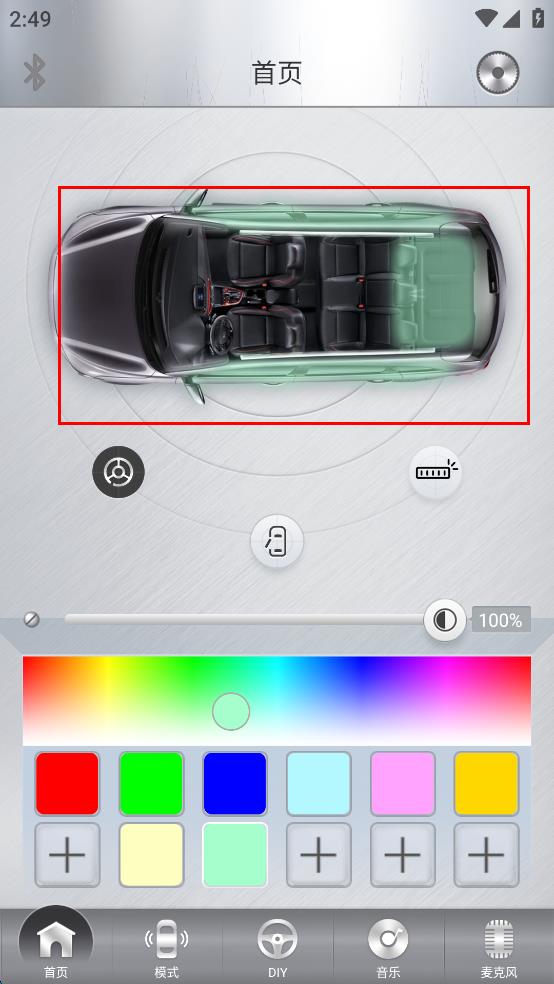 1、打開汽車氛圍燈控制APP,在首頁(yè)選擇顏色,調(diào)整汽車氛圍燈顏色。