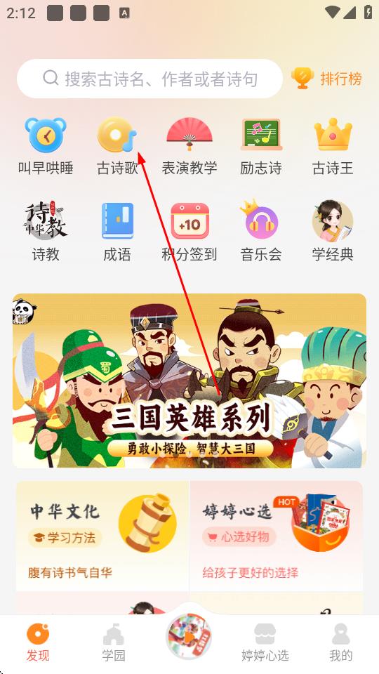1、打開婷婷詩教APP,進入發(fā)現(xiàn)頁面,點擊古詩歌圖標(biāo)。