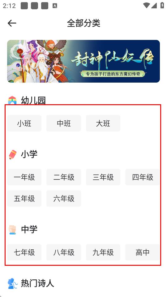 2、在全部分類頁面,選擇對應(yīng)的學(xué)段,如幼兒園的小班、中班、大班,或者小學(xué)、中學(xué)的各個年級。