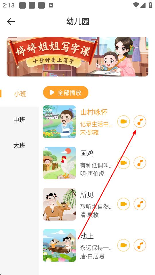 3、進入所選學(xué)段頁面后,找到想要聽的古詩,點擊右側(cè)的音樂播放圖標(biāo)。