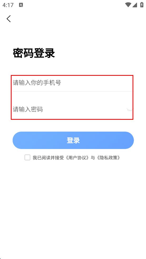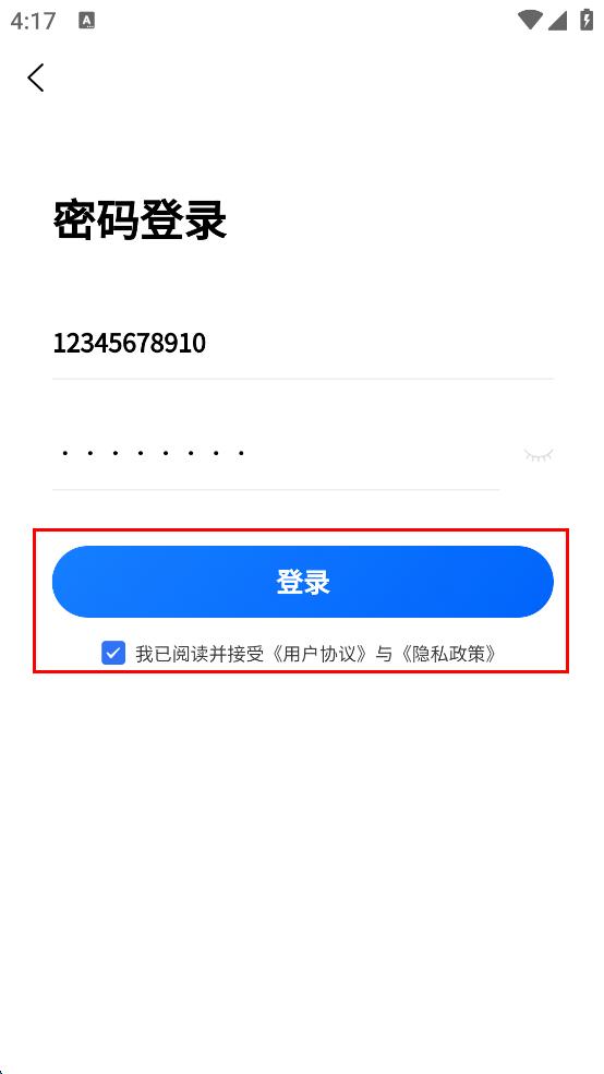 3、輸入手機(jī)號(hào)和密碼,勾選我已閱讀并接受用戶協(xié)議與隱私政策。