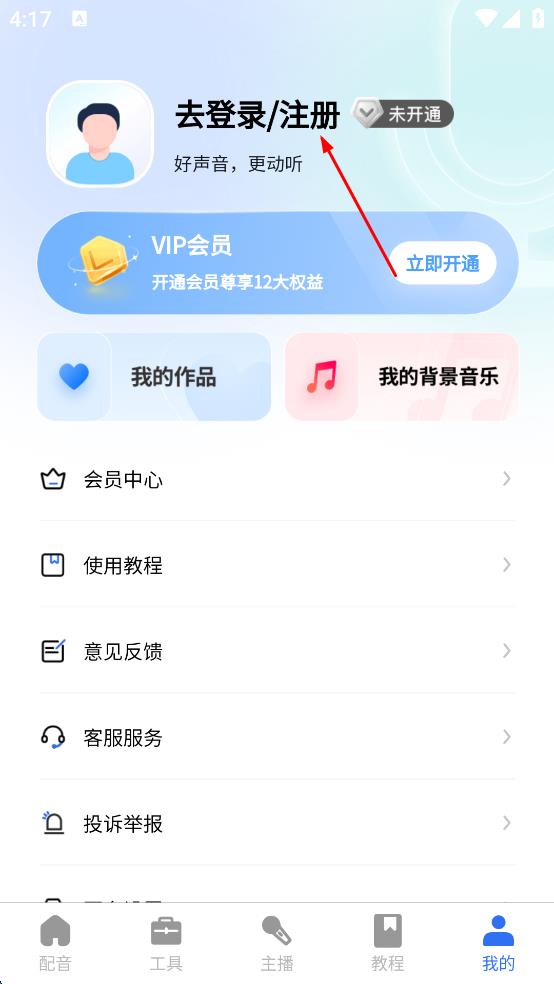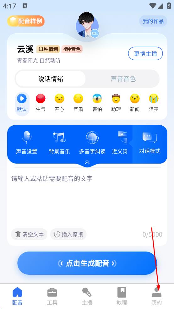 1、打開(kāi)某配音APP,進(jìn)入首頁(yè)后,點(diǎn)擊頁(yè)面右下角“我的”按鈕。
