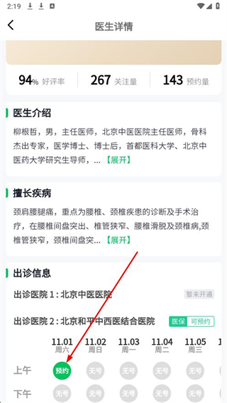 4、在醫(yī)生詳情頁(yè)面,選擇出診時(shí)間并點(diǎn)擊預(yù)約,完成掛號(hào)預(yù)約操作。