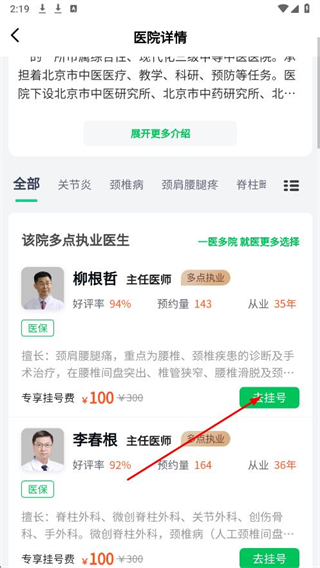 3、在醫(yī)院詳情頁(yè)面,選擇醫(yī)生并點(diǎn)擊去掛號(hào)。