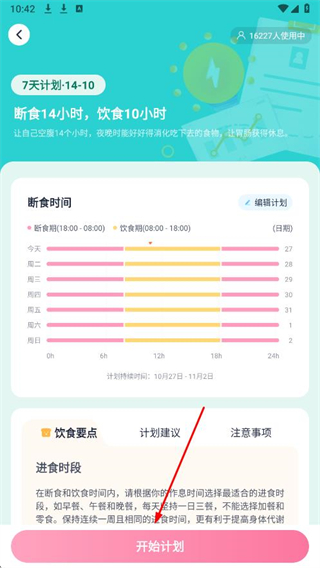 3、進(jìn)入所選計(jì)劃詳情頁(yè)面后,點(diǎn)擊開(kāi)始計(jì)劃,即可重新制定斷食計(jì)劃。