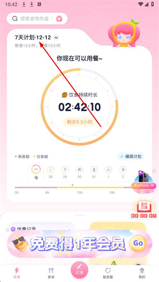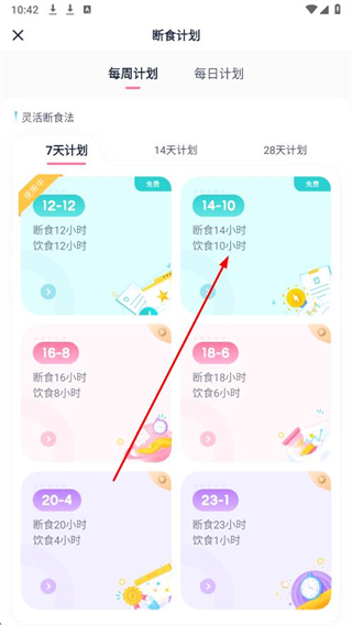 2、在斷食計(jì)劃頁(yè)面,選擇想要重新制定的計(jì)劃類(lèi)型,如7天計(jì)劃中的14-10。