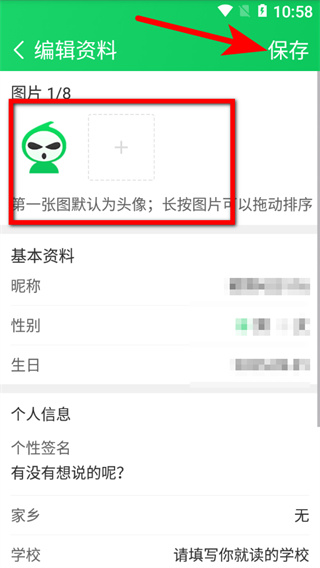4、在編輯資料頁(yè)面,點(diǎn)擊頭像區(qū)域添加圖片后點(diǎn)擊保存按鈕,即可完成頭像更改操作。