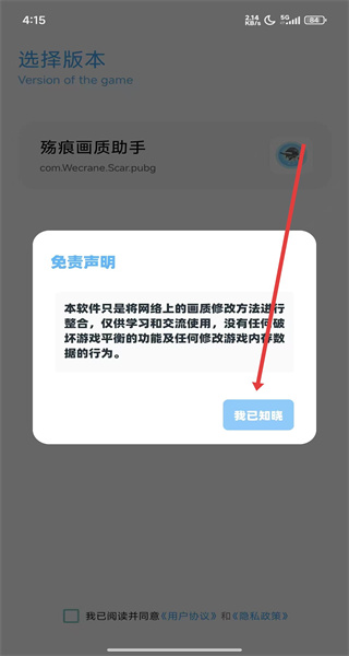 1、打開(kāi)殤痕畫(huà)質(zhì)助手相關(guān)界面,彈出免責(zé)聲明窗口,點(diǎn)擊我已知曉按鈕后使用。