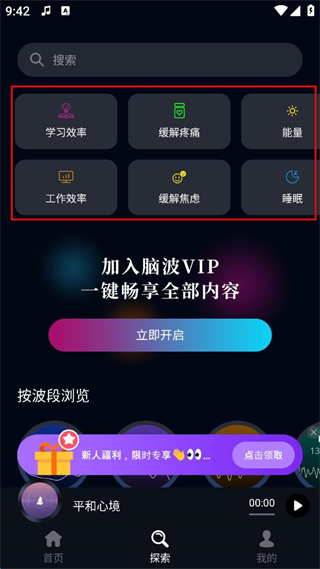 4、可選擇學(xué)習(xí)效率、緩解焦慮、睡眠等分類,進(jìn)而使用對應(yīng)腦波內(nèi)容。