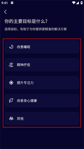 2、在目標(biāo)選擇頁面,選擇如改善睡眠、提升專注力等其中一個主要目標(biāo)。