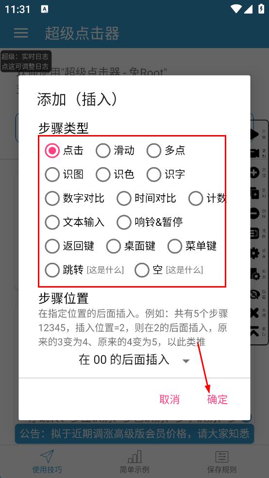 3、在添加步驟類型中選擇點擊,然后點擊確定。