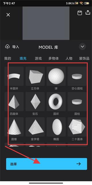 3.進(jìn)入MODEL庫(kù)后,選擇喜歡的3D模型,如球體、立方體等,然后點(diǎn)擊選擇按鈕。
